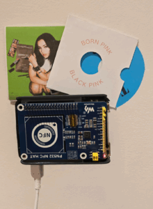 So the “SayDeeJayBox” player uses a Raspberry Pi microcomputer with an NFC hat to allow her to tap mini “records” to activate playback of specific albums just on her speaker.  The records themselves are printed/cut on a Cricut machine and affixed with an ntag NFC sticker that is programmed with the activation URL on my phone. The Pi simply sits there listening for an NFC tap and then uses that URL to activate a web script that is authorised to control our home Sonos.